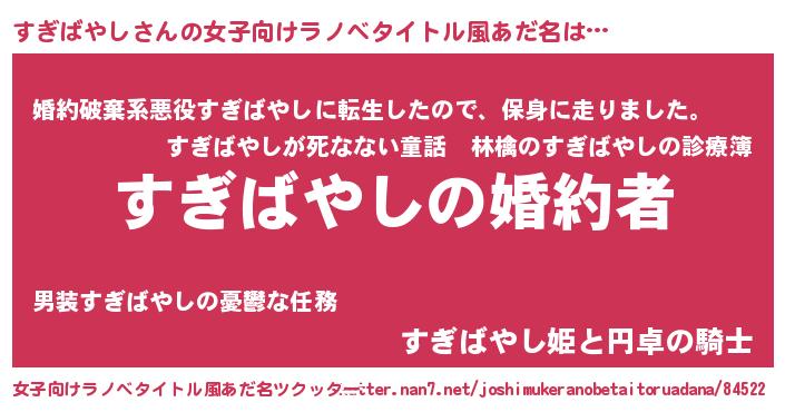 | 男性向けラノベタイトル風あだ名 | 『うちの娘の為ならば、俺はもしかしたらすぎばやしも倒せるかもしれない。』 |