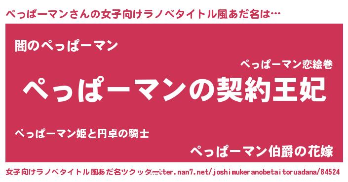 ぺっぱーマンさんの女子向けラノベタイトル風あだ名は… 『ぺっぱーマンの契約王妃』『闇のぺっぱーマン』『ぺっぱーマン伯爵の花嫁』 ツクッター #女子向けラノベタイトル風あだ名ツクッター http://tkutter.nan7.net/joshimukeranobetaitoruadana/84524/