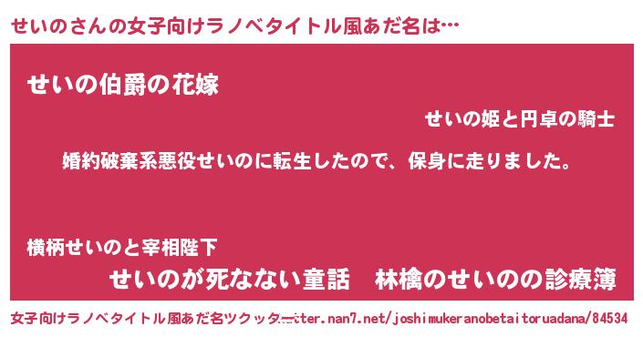 男性向けラノベタイトル風あだ名 | 『セイノスレイヤー』『魔弾の王とせいの』 |