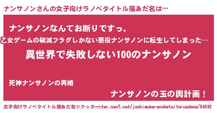 | 男性向けラノベタイトル風あだ名 | 『ナンサノンという概念が存在しない退屈な世界 』 |