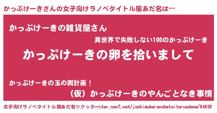 | 男性向けラノベタイトル風あだ名 | 『かっぷけーきの嫁は女の子じゃないと思った?』 |