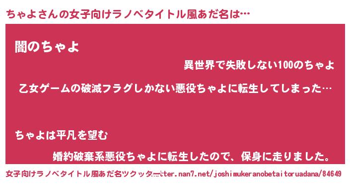 | 男性向けラノベタイトル風あだ名 | 『魔弾の王とちゃよ』 |