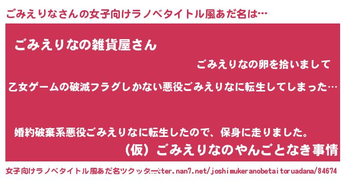 | 胡散臭い通販商品みたいなあだ名 | 『世界中を虜にした100年もののヴィンテージワイン…その名も「ごみえりな」』 |