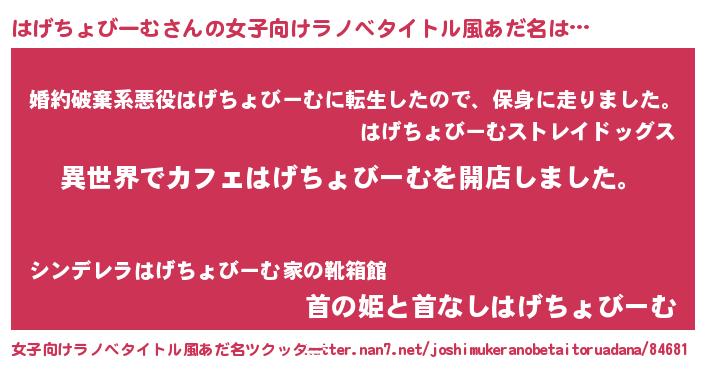 | 男性向けラノベタイトル風あだ名 | 『誰もが恐れるあのはげちょびーむが、ぼくの専属メイドになるようです。』 |