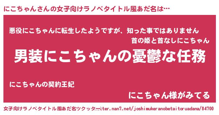 | 男性向けラノベタイトル風あだ名 | 『うちのにこちゃんが世界を掌握している!』 |