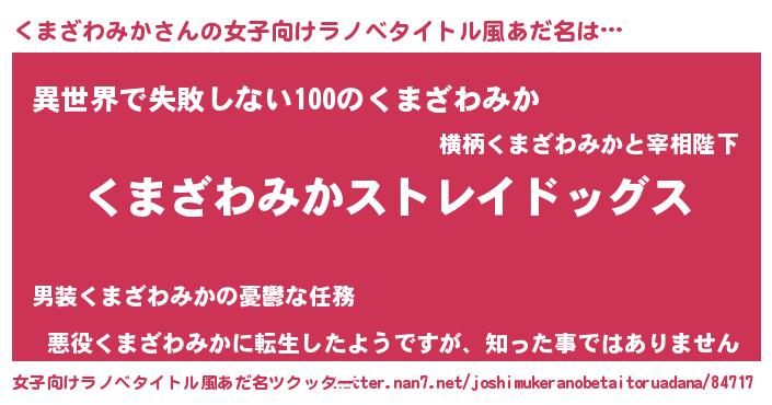 | 男性向けラノベタイトル風あだ名 | 『Re:くまざわみかから始める異世界生活』 |