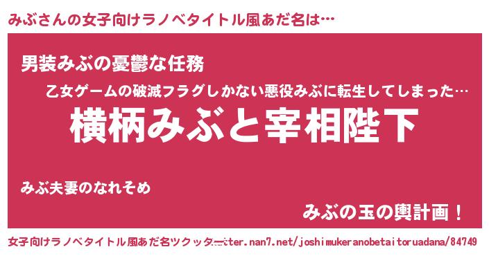 みぶさんの女子向けラノベタイトル風あだ名は… 『横柄みぶと宰相陛下』『男装みぶの憂鬱な任務』『みぶの玉の輿計画!』 ツクッター #女子向けラノベタイトル風あだ名ツクッター http://tkutter.nan7.net/joshimukeranobetaitoruadana/84749/