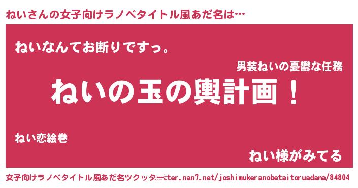 | 男性向けラノベタイトル風あだ名 | 『転生したらねいだった件』 |
