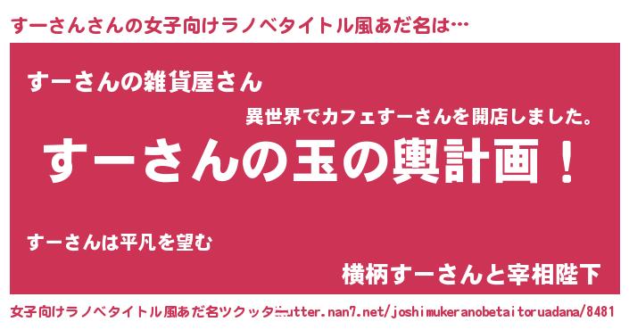 | 男性向けラノベタイトル風あだ名 | 『すーさん~年齢イコール彼女いない歴の魔法使い~』 |