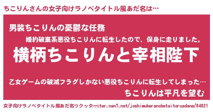 | 男性向けラノベタイトル風あだ名 | 『ちこりんに滅ぼされるだけの簡単なお仕事です』 |