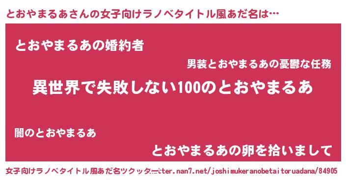 | 男性向けラノベタイトル風あだ名 | 『とおやまるあという概念が存在しない退屈な世界 』 |