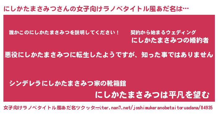| 胡散臭い通販商品みたいなあだ名 | 『あなたにだけ特別に提供する限定10本のレアな日本酒…その名も「にしかたまさみつ」』 |