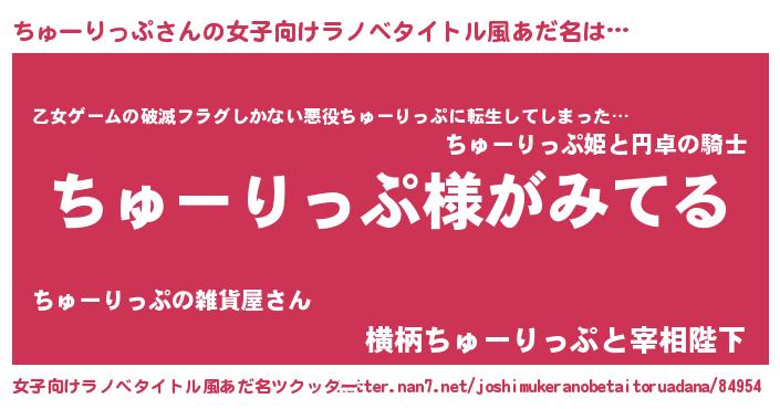| 男性向けラノベタイトル風あだ名 | 『ちゅーりっぷの嫁は女の子じゃないと思った?』 |