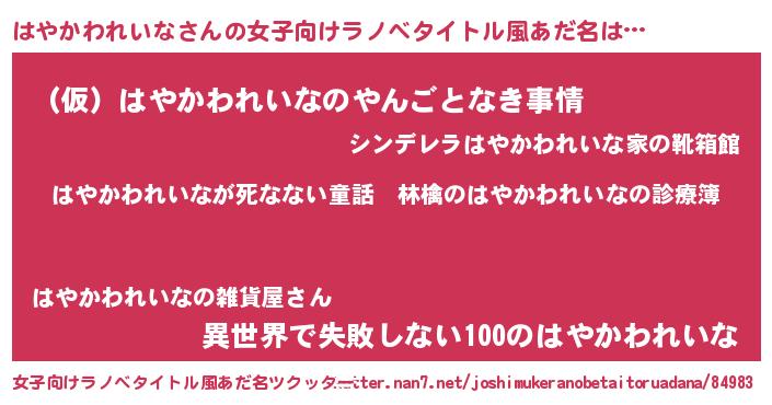 | 男性向けラノベタイトル風あだ名 | 『魔弾の王とはやかわれいな』 |