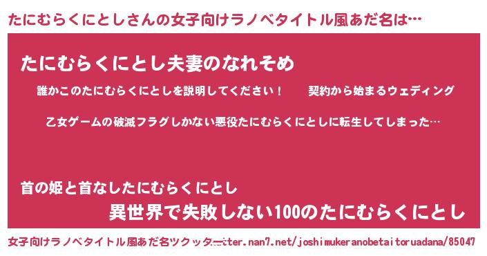 | 男性向けラノベタイトル風あだ名 | 『この素晴らしい世界にたにむらくにとしを!』 |