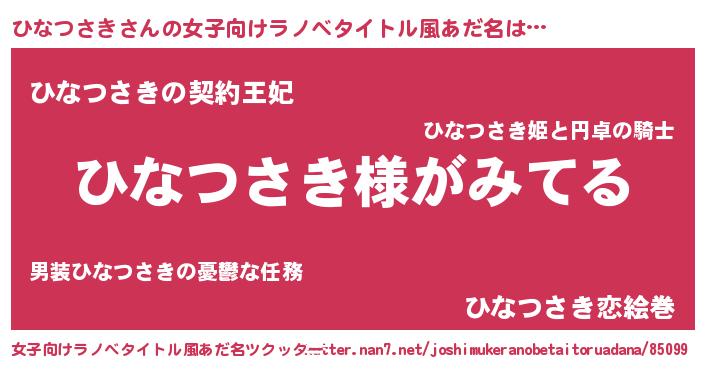 | 男性向けラノベタイトル風あだ名 | 『ひなつさきの嫁は女の子じゃないと思った?』 |