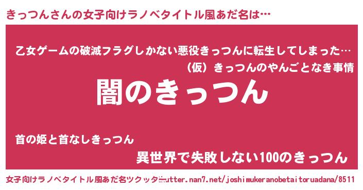 | 男性向けラノベタイトル風あだ名 | 『Re:きっつんから始める異世界生活』 |