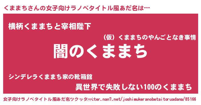 | 男性向けラノベタイトル風あだ名 | 『Re:くままちから始める異世界生活』 |