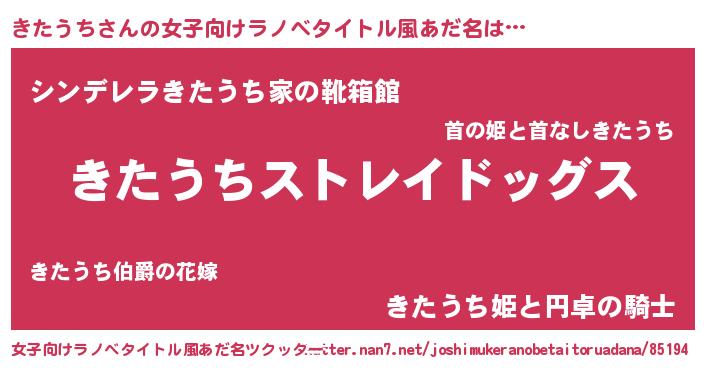 きたうちさんの女子向けラノベタイトル風あだ名は… 『きたうちストレイドッグス』『シンデレラきたうち家の靴箱館』『きたうち姫と円卓の騎士』 ツクッター #女子向けラノベタイトル風あだ名ツクッター http://tkutter.nan7.net/joshimukeranobetaitoruadana/85194/