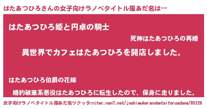 | 男性向けラノベタイトル風あだ名 | 『誰もが恐れるあのはたあつひろが、ぼくの専属メイドになるようです。』 |