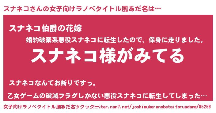 | 男性向けラノベタイトル風あだ名 | 『スナネコの嫁は女の子じゃないと思った?』 |