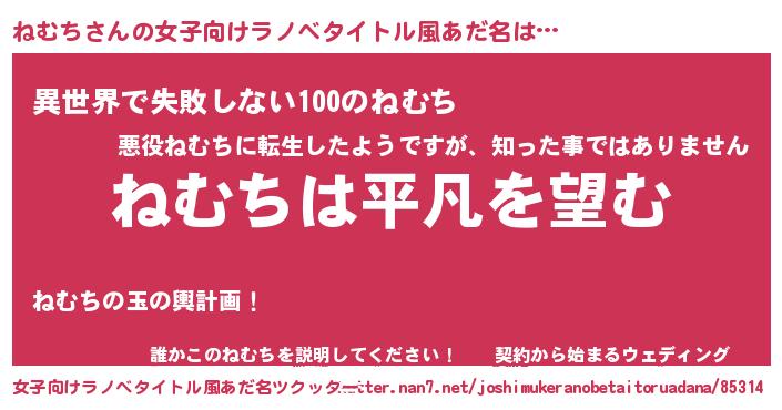 | 男性向けラノベタイトル風あだ名 | 『ダンジョンにねむちを求めるのは間違っているだろうか』 |
