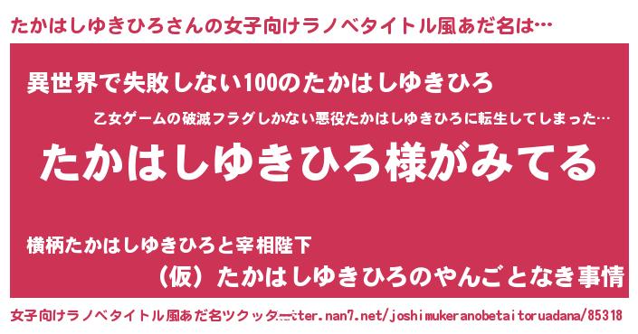 | 男性向けラノベタイトル風あだ名 | 『たかはしゆきひろの嫁は女の子じゃないと思った?』 |