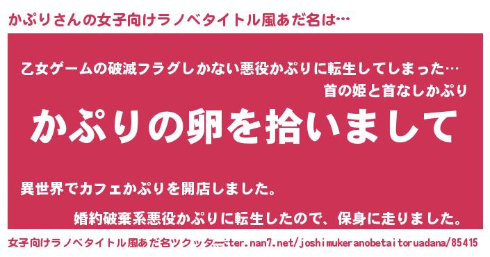 | 男性向けラノベタイトル風あだ名 | 『ダンジョンにかぷりを求めるのは間違っているだろうか』 |