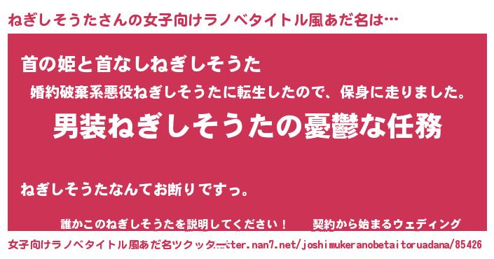 | 男性向けラノベタイトル風あだ名 | 『うちのねぎしそうたが世界を掌握している!』 |