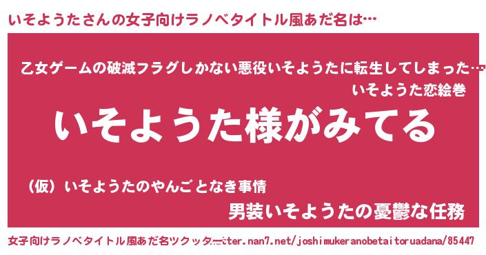 | 男性向けラノベタイトル風あだ名 | 『いそようたの嫁は女の子じゃないと思った?』 |