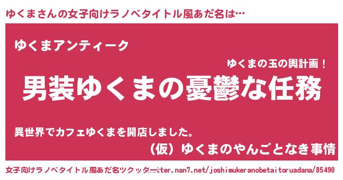 | 男性向けラノベタイトル風あだ名 | 『うちのゆくまが世界を掌握している!』 |
