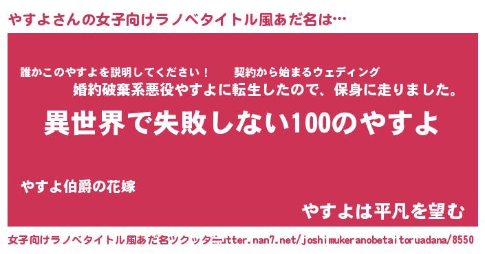 | 男性向けラノベタイトル風あだ名 | 『やすよという概念が存在しない退屈な世界 』 |