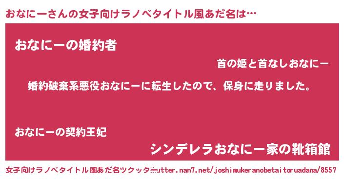おなにーさんの女子向けラノベタイトル風あだ名は… 『婚約破棄系悪役おなにーに転生したので、保身に走りました。』『おなにーの婚約者』『シンデレラおなにー家の靴箱館』 ツクッター #女子向けラノベタイトル風あだ名ツクッター http://tkutter.nan7.net/joshimukeranobetaitoruadana/8557/