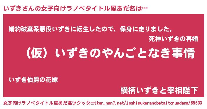 | 男性向けラノベタイトル風あだ名 | 『いずきの憂鬱』『イズキスレイヤー』 |