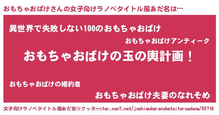 | 男性向けラノベタイトル風あだ名 | 『おもちゃおばけ~年齢イコール彼女いない歴の魔法使い~』 |