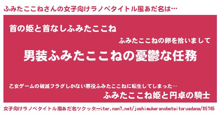 | 男性向けラノベタイトル風あだ名 | 『うちのふみたここねが世界を掌握している!』 |