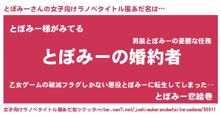 とぼみーさんの女子向けラノベタイトル風あだ名は… 『とぼみーの婚約者』『とぼみー様がみてる』『とぼみー恋絵巻』 ツクッター #女子向けラノベタイトル風あだ名ツクッター http://tkutter.nan7.net/joshimukeranobetaitoruadana/85811/