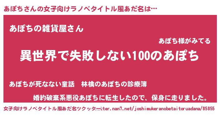 | 男性向けラノベタイトル風あだ名 | 『あぽちという概念が存在しない退屈な世界 』 |