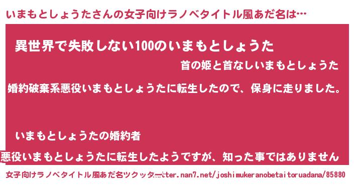 | 男性向けラノベタイトル風あだ名 | 『イマモトショウタスレイヤー』 |