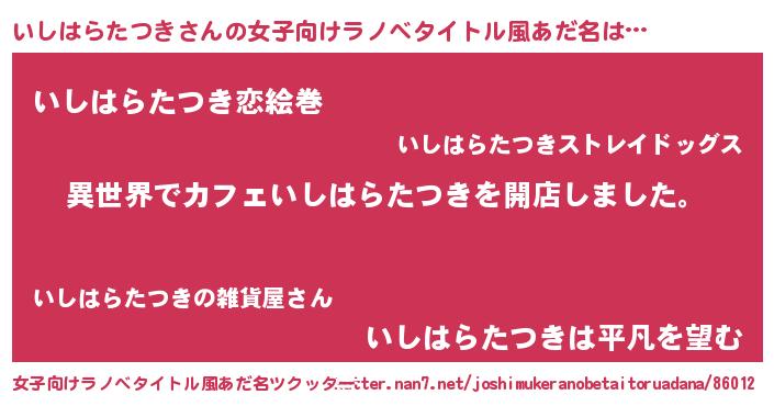 いしはらたつきさんの女子向けラノベタイトル風あだ名は… 『異世界でカフェいしはらたつきを開店しました。』『いしはらたつき恋絵巻』『いしはらたつきは平凡を望む』 ツクッター #女子向けラノベタイトル風あだ名ツクッター http://tkutter.nan7.net/joshimukeranobetaitoruadana/86012/