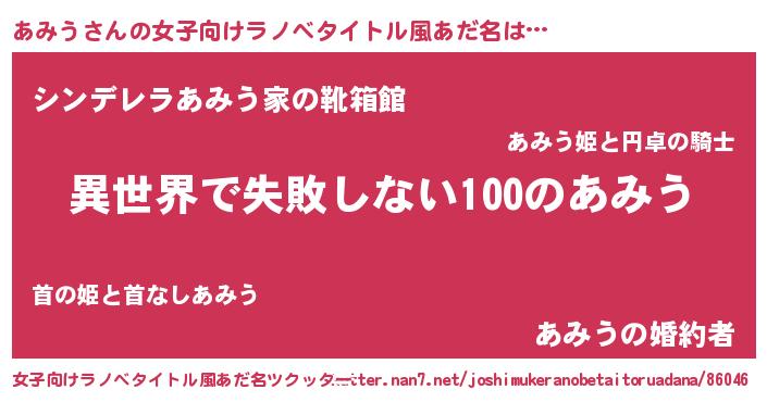 | 男性向けラノベタイトル風あだ名 | 『あみうという概念が存在しない退屈な世界 』 |