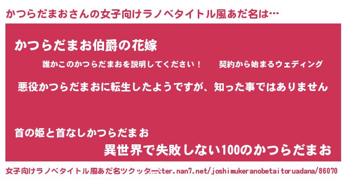 | 男性向けラノベタイトル風あだ名 | 『この素晴らしい世界にかつらだまおを!』 |