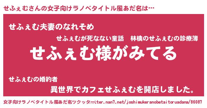 | 男性向けラノベタイトル風あだ名 | 『せふぇむの嫁は女の子じゃないと思った?』 |