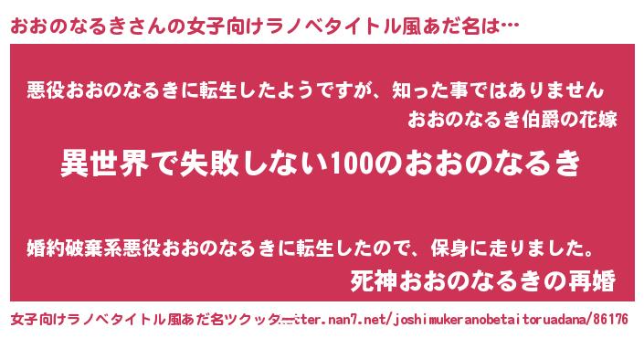 | 男性向けラノベタイトル風あだ名 | 『おおのなるきという概念が存在しない退屈な世界 』 |