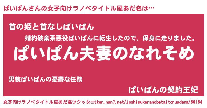 | 男性向けラノベタイトル風あだ名 | 『おまえをオタクにしてやるから、俺をぱいぱんにしてくれ! 』 |