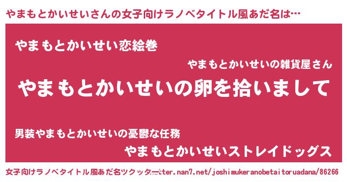 やまもとかいせいさんの女子向けラノベタイトル風あだ名は… 『やまもとかいせいの卵を拾いまして』『やまもとかいせい恋絵巻』『やまもとかいせいストレイドッグス』 ツクッター #女子向けラノベタイトル風あだ名ツクッター http://tkutter.nan7.net/joshimukeranobetaitoruadana/86266/