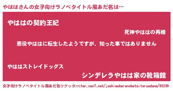 | 男性向けラノベタイトル風あだ名 | 『この素晴らしい世界にやははを!』 |