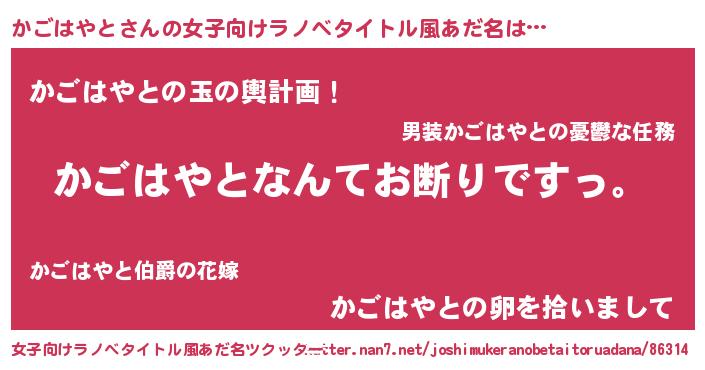 | ヒーロー風カッコイイあだ名 | 『超時空戦士カゴハヤト』『幻影騎士カゴ』 |