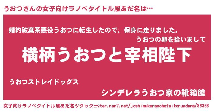 | 男性向けラノベタイトル風あだ名 | 『うおつに滅ぼされるだけの簡単なお仕事です』 |