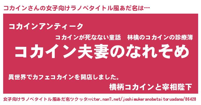 | 男性向けラノベタイトル風あだ名 | 『おまえをオタクにしてやるから、俺をコカインにしてくれ! 』 |